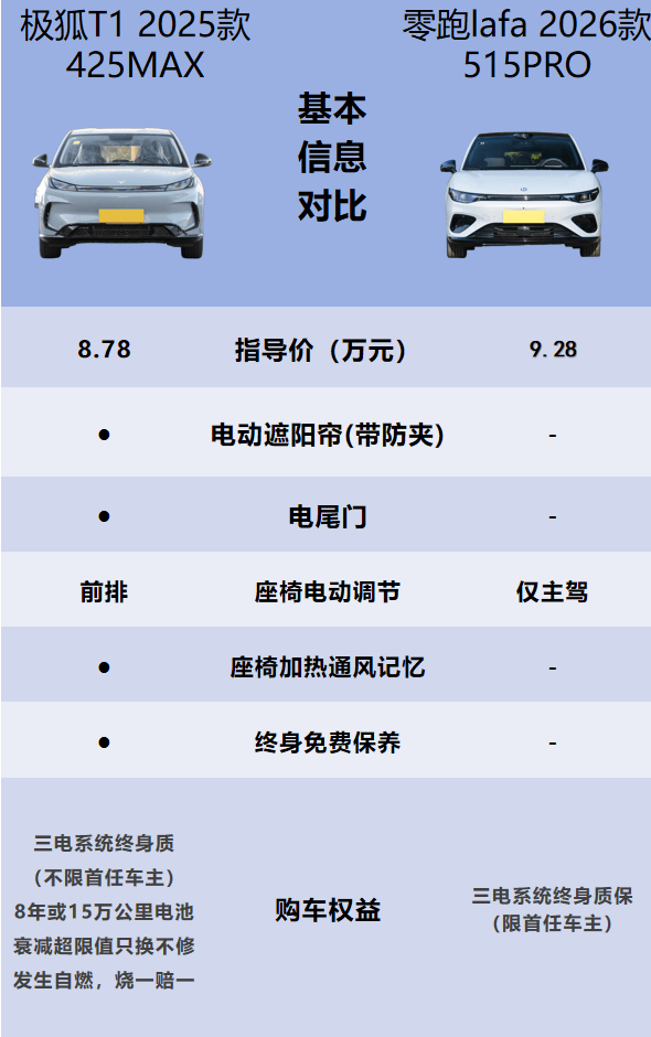 价格是很多家庭选车的第一考量,极狐T1 425MAX版本售价8.78万元,零跑lafa5 515PRO版本则为9.28万元,极狐T1不仅价格低了5000元,在配置和质保上还更具诚意。花更少的钱能买到更全面的体验,这对注重性价比的家庭用户来说,无疑是极具吸引力的一点。