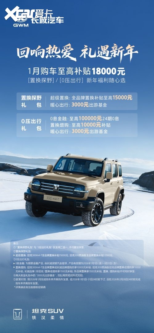 官方网站新年启幕,礼遇加码。在50万用户的支持下,坦克300在2025年高光不断、业绩亮眼。为回馈50万热爱,特别推出1月购车礼遇,即日起至1月31日,购坦克300可享“置换探野礼包”或“0压出行礼包”,置换补贴至高1.8万,为用户开启更实惠的冬季出行体验。