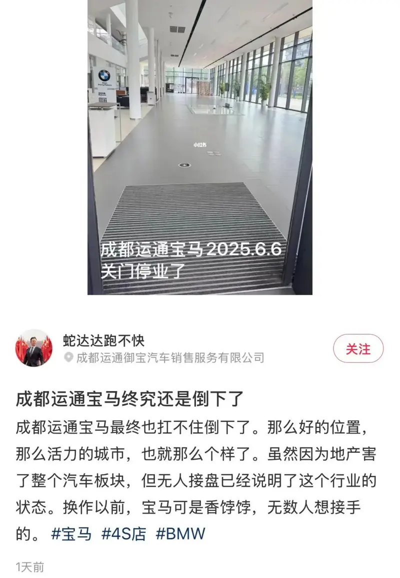 2025年6月6日,位于成都市的运通宝马4S店正式关门歇业。不止成都,2024年9月,宝马中国终止了与新加坡G.A.集团旗下9家4S店的合作,涉及北京、厦门等地。今年,浙江杭州、江苏泰州等地的宝信宝马4S店也陆续出现售后保养纷争。