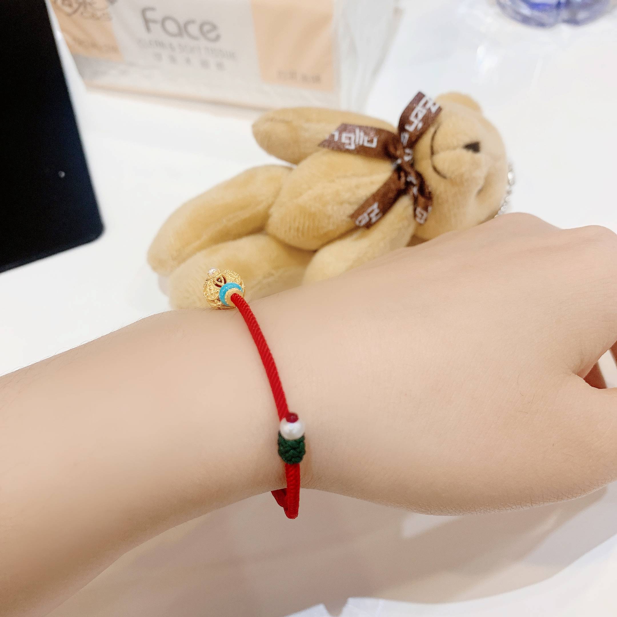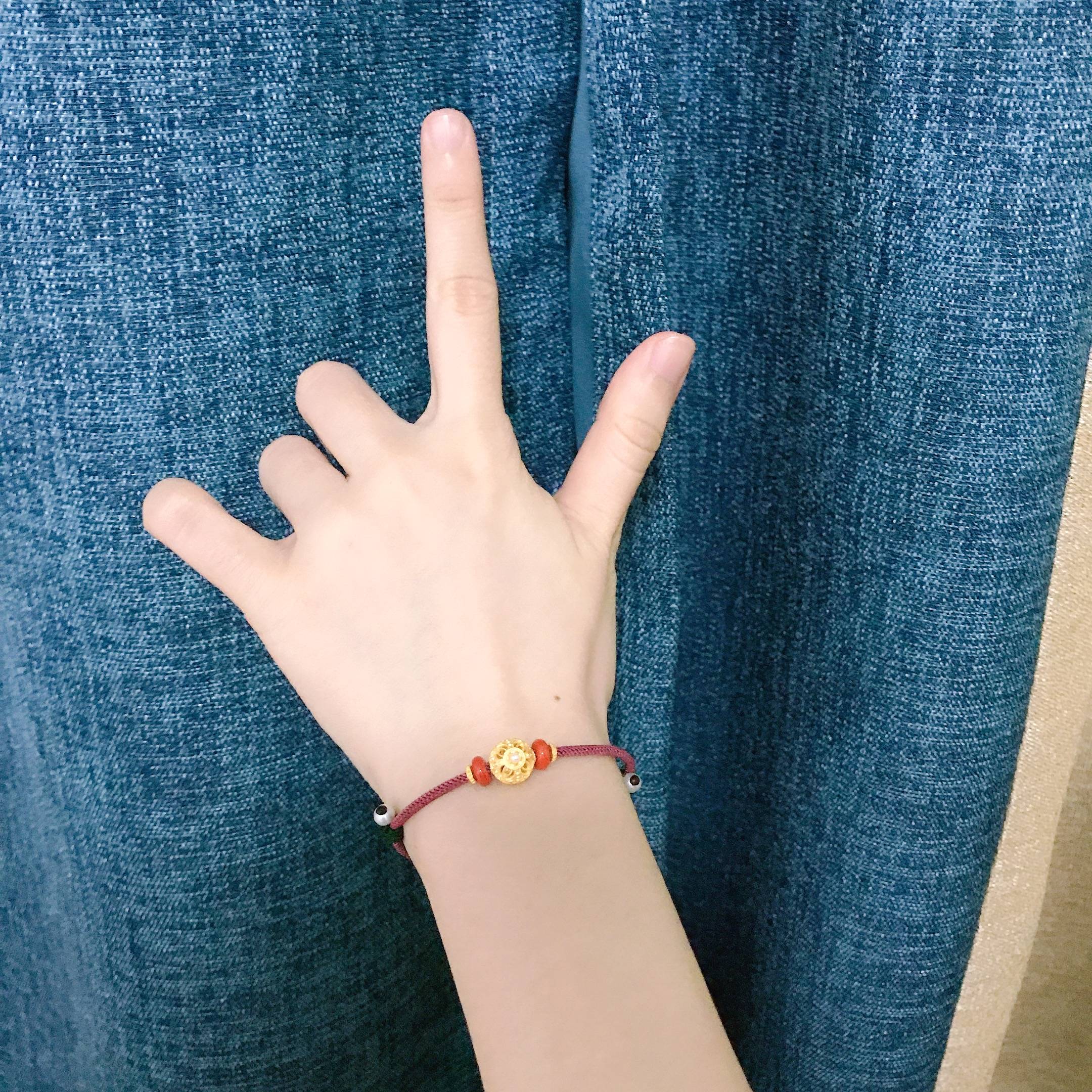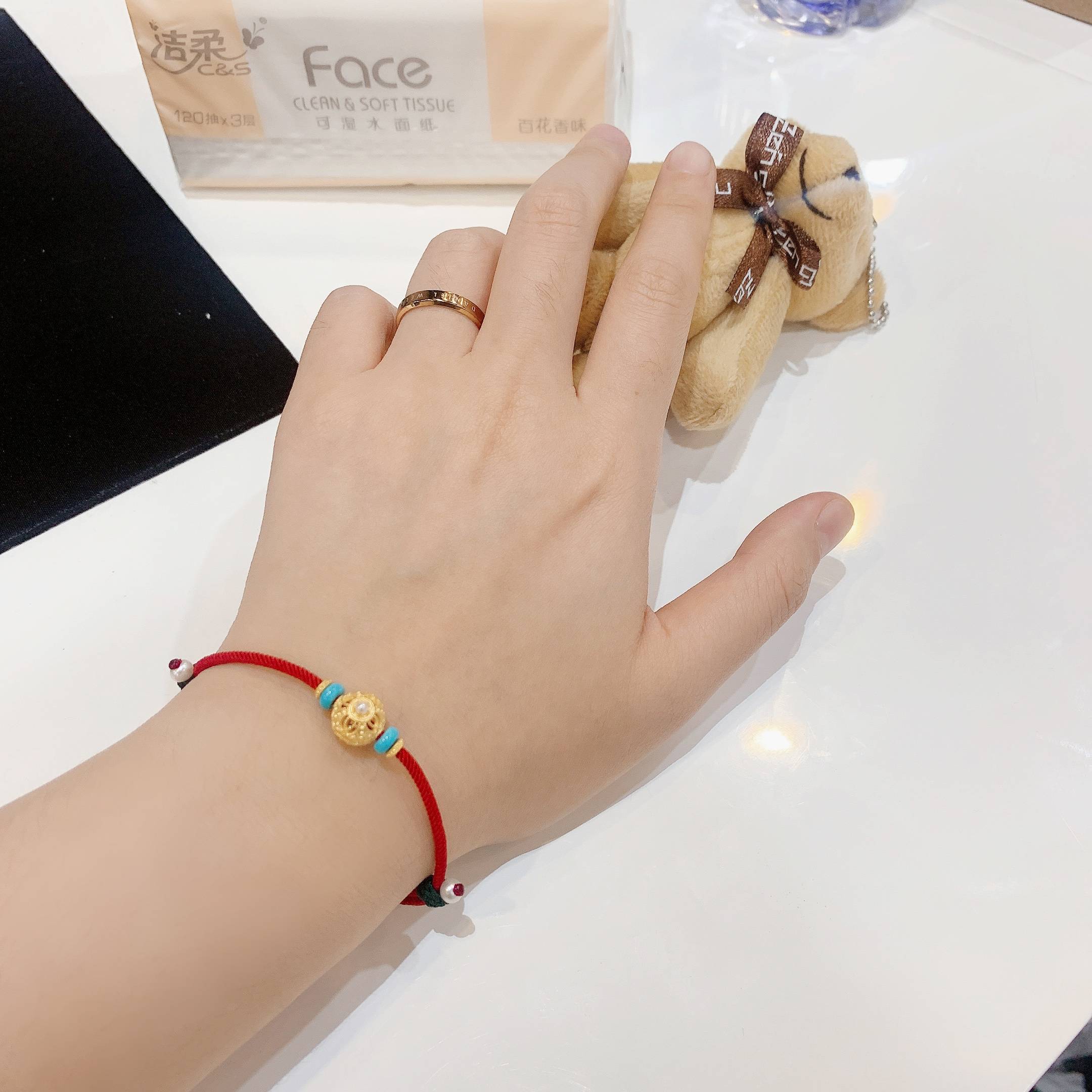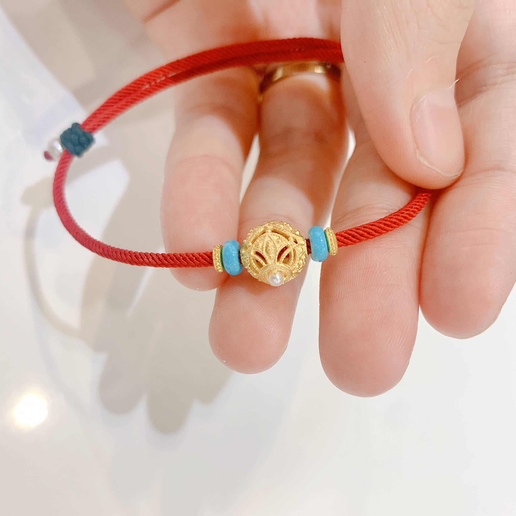 首先你需要准备这么一个黄金手串,手绳款式的就很不错,拆开也不会心疼。这是越王丰瑞花开手串,中间的花球、松石和黄金夹片都可以保留下来,手绳也可以留着不要扔。(其实单戴它也挺好看的,是那种休闲的风格,本命年戴就很合适。)