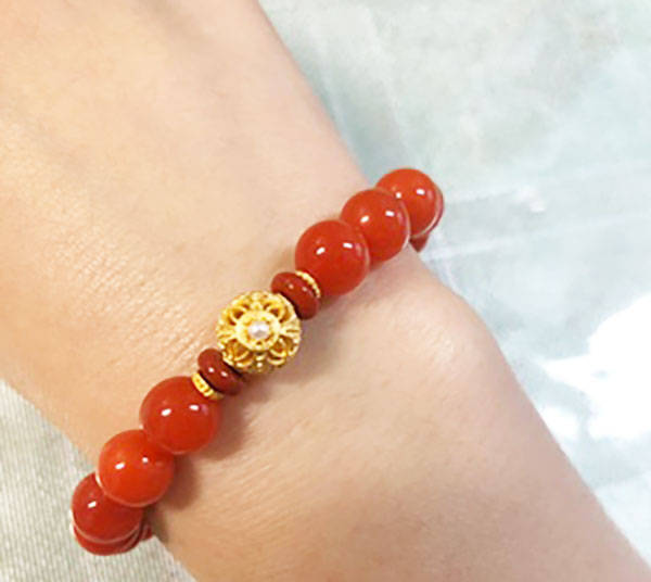 如果觉得颜色很难把握或是不想太麻烦的朋友,可以用纯色系的佛珠,这种珊瑚红的珠子和金球就很搭配,因为这个手串本身就带有两个松石或南红玛瑙,需要强调的是这个小金球比较秀气,建议还是搭配稍小一些的珠子,整体会更加温柔一些。