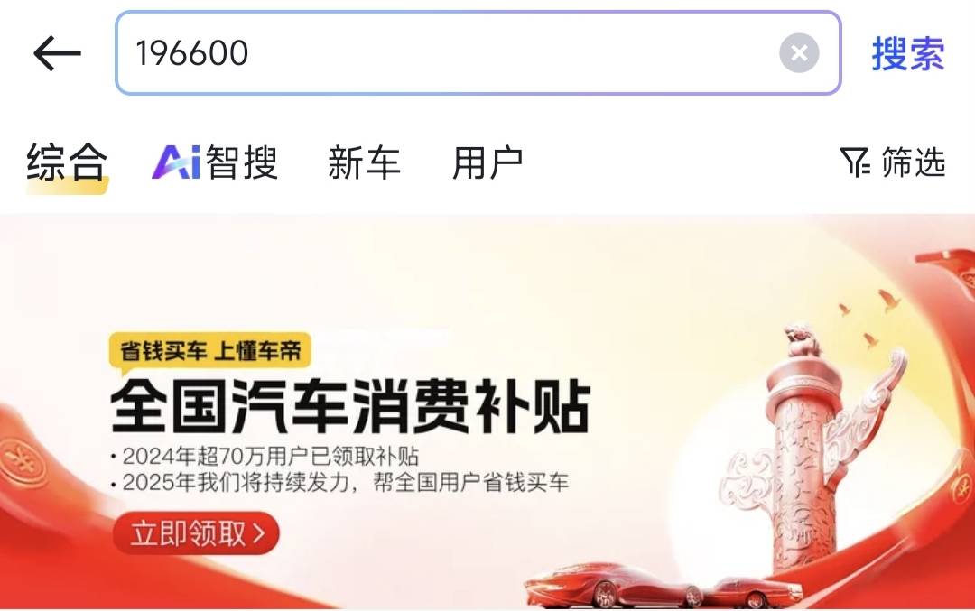 进入官方申领通道:下载并登录懂车帝APP,在首页顶部搜索框输入专属口令196600,直接进入全国汽车消费补贴专属申请专区,系统将自动定位匹配所在省市的最新补贴政策。