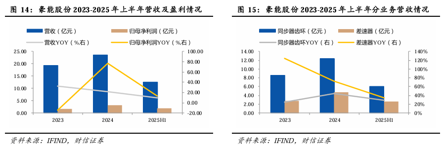 国内同步器龙头企业。公司主要从事汽车传动系统相关零部件产品的研发、生产和销售以及航空航天零部件的高端精密制造。其中汽车零部件业务包括同步器和差速器两大总成系统,为国内同步器龙头企业,差速器业务高速增长,2023年/2024年/2025年上半年差速器业务营收同比增长124.54%/72.80%/34.36%。此外还涉及空心电机轴、定子转子、行星减速器、DCT双离合器零件、商用车AMT行星机构零件和轨道交通传动系统零件。产品主要应用于燃油车和新能源汽车,覆盖乘用车、商用车、工程机械车辆和轨道交通系统。产品主要配套车系有:奔驰、宝马、奥迪、大众、红旗、吉利、长安、一汽、比亚迪、问界、小米、蔚来、理想、重汽、福田等。