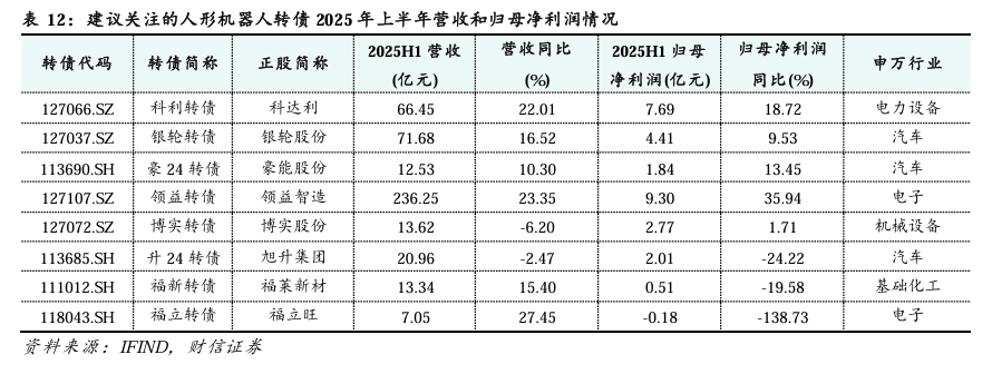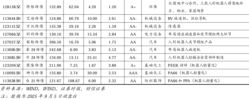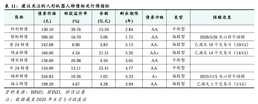 建议重点关注4家零部件转债和1家人形机器人本体的转债:1)科利转债。布局关节和减速器,绝对价格不高的平衡型转债,具备业绩支撑。2)银轮转债。布局关节模组,高价、偏股型转债,具备业绩支撑短期没有强赎风险。3)豪24转债。布局减速器等,高价、偏股型转债,转股溢价率相对较低,次新债,具备业绩支撑;但需关注后续强赎风险。4)领益转债。布局减速器、丝杠、灵巧手等,具备业绩支撑,高评级次新债,转股溢价率低的偏股型转债,但需关注后续强赎风险。5)博实转债。原生机器人厂商,与哈工大进行科研合作,绝对价格不高的平衡型转债。可以关注升24转债(铝镁合金、轻量化)、福新转债(传感器、电子皮肤)、福立转债(精密丝杠)。