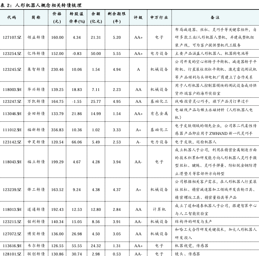 我们对人形机器人的相关概念转债进行了梳理,多集中在上游零部件环节,各细分领域的头部企业相对较少,但在人形机器人领域积极布局和推进,有望受益于人形机器人板块的β行情。进一步综合考虑正股基本面、转债价格和估值、条款等因素:
