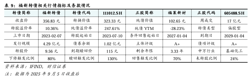 福新转债:高价、偏股型转债。截至2025年9月5日,福新转债收盘价为356.83元,转股溢价率为10.36%,为偏股型转债;剩余余额为1.02亿元,规模较小;剩余期限为3.33年;债券评级为A+;且公司公告于2025年11月5日及以前不强赎。