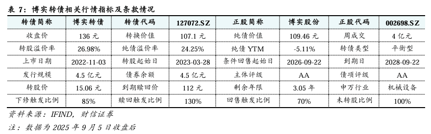 博实转债:平衡型转债。截至2025年9月5日,博实转债收盘价为136元,转股溢价率为26.98%,为平衡型转债;剩余余额为4.5亿元,规模相对较小;剩余期限为3.05年;债券评级为AA。