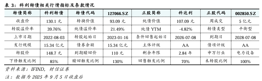科利转债:平衡型转债。截至2025年9月5日,科利转债收盘价为130.1元,转股溢价率为39.76%,纯债溢价率为21.49%,为平衡型转债;剩余余额为15.34亿元;剩余期限为2.84年;债券评级为AA。
