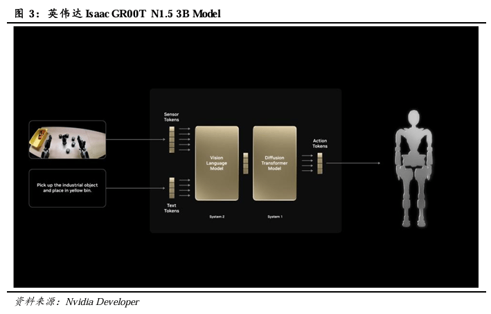 相较国内科技企业,国外科技大厂对具身智能大模型重视程度更高,入局时间更早,如谷歌从2022年起推出了RT(Robotic Transformer)系列模型并完成了多次技术迭代;英伟达于2024年3月发布了GR00T项目,构建“硬件(Jetson系列)+软件(Isaac平台)+生态(仿真、模型、合作伙伴)”的完整技术生态,且不断更新迭代,英伟达在2025年8月末发布新一代机器人计算平台JetsonThor开发套件及量产模组,这款机器人的“新大脑”或将强化机器人实时推理能力,为机器人智能化升级提供算力支撑;Figure AI在2025年2月发布首个自研人形VLA模型Helix。国内层面,如智元于2025年3月发布首个通用具身基座模型——智元启元大模型(GO-1);银河通用分别于2025年1月和6月发布端到端抓取大模型GraspVLA与端到端导航大模型TrackVLA等。