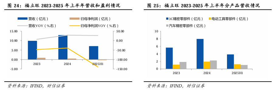 公司深耕精密零部件业务。公司自成立以来一直专注于精密金属零部件的研发、制造和销售,主要客户为3C、汽车、电动工具等下游应用行业。2025年H1实现营收7.05亿元,同比增长27.45%;归母净利润-0.18亿元,同比下降138.73%。1)3C业务来看,2025年H1公司3C精密金属零部件业务实现收入3.87亿元,同比增长10.01%。公司继续深耕消费电子精密金属零部件领域,不断加大技术创新力度,持续地进行工艺改进。2)汽车业务来看,公司汽车精密金属零部件业务2025年H1实现营收1.03亿元,同比下降0.64%。3)电动工具业务来看,公司2025年H1实现营收1.21亿元,同比增长145.69%。