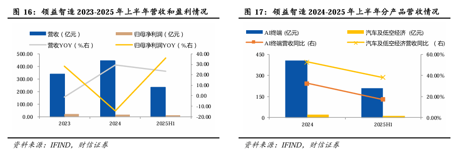 AI终端业务持续成长。公司2025年上半年实现营业收入236.25亿元,同比增长23.35%,归属于上市公司股东的净利润9.30亿元,同比增长35.94%。分业务来看:1)AI终端业务方面,实现收入约208.65亿元,同比增长17.26%,毛利率约为16.89%,同比提升0.34个百分点。在各细分产品板块,材料、热管理(散热)、传感器及相关模组、精品组装及相关等终端核心零组件业务在收入快速提升的同时,保持了较高的毛利水平。此外,作为苹果链的核心供应商,公司短期有望受益于新品发布等事件催化。2)汽车及低空经济业务方面,凭借在工艺能力提升及效率提升方面进展较好,公司市场份额及盈利能力不断提升,实现收入11.83亿元,同比增长38.41%,毛利率同比提升13.27个百分点。