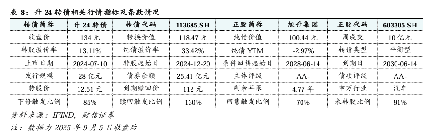 升24转债:平衡型转债。截至2025年9月5日,升24转债收盘价为134元,转股溢价率为13.11%,为平衡型转债;剩余余额为25.41亿元,有一定规模;剩余期限为4.77年;债券评级为AA-。