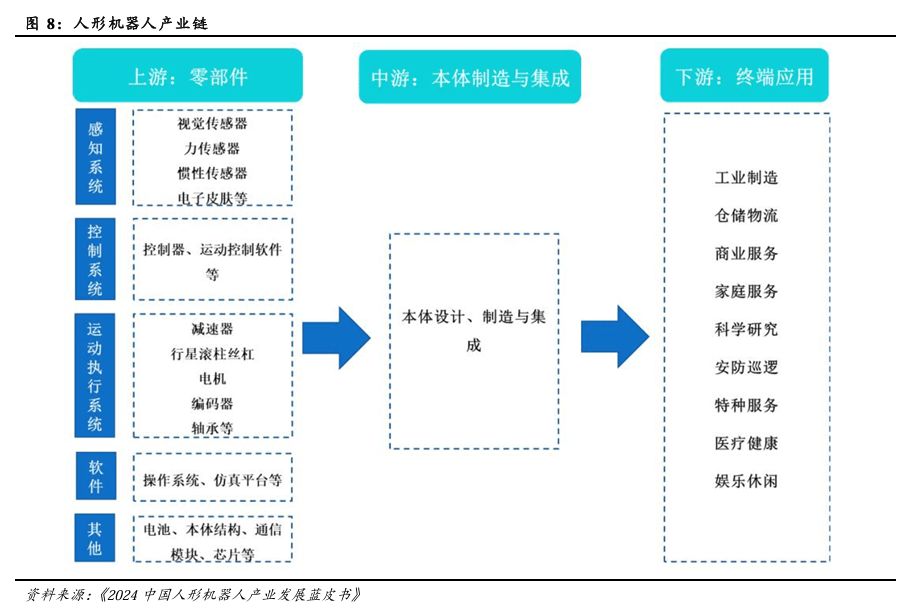 人形机器人产业链由上游零部件供应、中游本体制造与集成、下游多元应用领域三大板块构成。上游零部件主要包括决策控制系统、感知系统、运动执行系统和其他零部件等,其中从当下看,价值占比高、增量空间大的主要是传感器、减速器、电机、丝杠等核心零部件。中游本体制造与集成主要负责整机的设计、组装和测试,以及将上游零部件和中游本体进行整合,此环节当前利润空间相对较小,但随着技术成熟和规模化生产,未来具有较大的弹性。下游应用领域,人形机器人未来有望广泛应用于制造、物流、医疗、教育、家庭陪护等多个领域,但目前来看,离人形机器人实现规模化商业落地仍有一段距离。