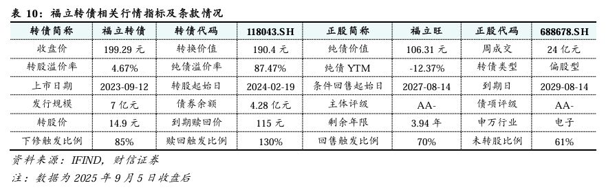 福立转债:偏股型转债。截至2025年9月5日,福立转债收盘价为199.29元,转股溢价率为4.67%,为偏股型转债;剩余余额为4.28亿元;剩余期限为3.94年;债券评级为AA-。