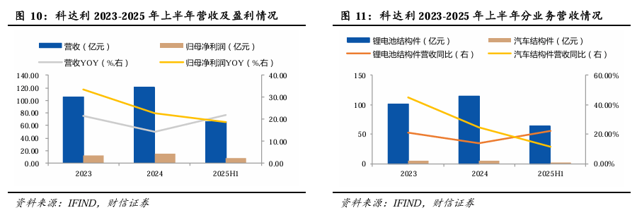 精密结构件行业龙头公司。公司主营电池精密结构件和汽车结构件研发及制造,公司产品主要分为新能源汽车动力电池精密结构件、储能电池精密结构件、消费类电池精密结构件以及汽车零部件,广泛应用于汽车及新能源汽车、动力电池、便携式通讯电子产品、电动工具、储能电站等众多行业领域。2024年公司营收120.30亿元,同比+14.44%,归母净利润14.72亿元,同比+22.55%;2025年上半年公司营收66.45亿元,同比+22.01%,归母净利润7.69亿元,同比+18.72%。其中,锂电池结构件为核心业务,2024年营收占比为95.37%。