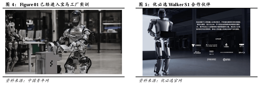 4)下游应用场景广泛,商业落地化推进。人形机器人的通用性、智能性有望不断拓展和深化其应用场景,深刻变革人类生产生活方式,引领社会走向全新的智能化发展阶段。应用场景来看,未来人形机器人有望广泛应用于工业制造、仓储物流、民生服务及特种应用领域,近两年人形机器人商业化落地进展持续推进,如人形机器人Figure 01已经进入宝马工厂实训,优必选人形机器人Walker S1已经先后走进比亚迪等汽车工厂“打工”,宇树科技的人形机器人应用于研究、教育和消费领域等。中长期来看,随着人形机器人的通用性、安全性、智能性的不断提高,人形机器人有望走向千家万户,从To B场景延伸至To C场景,拓展广阔的市场空间。