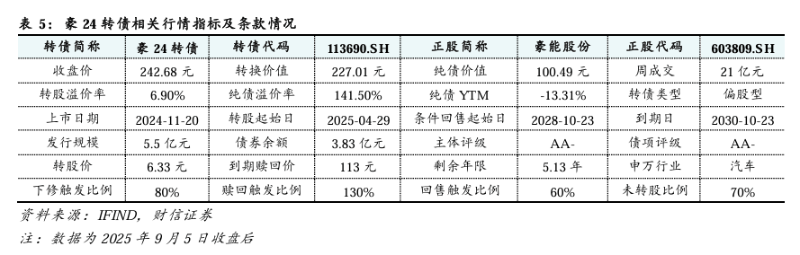 豪24转债:次新债,高价偏股型转债。2024年11月20日上市,2025年4月29日进入转股期,为次新债;截至2025年9月5日,豪24转债收盘价为242.68元,转股溢价率为6.9%,为高价、偏股型转债;剩余余额为3.83亿元,规模相对较小。