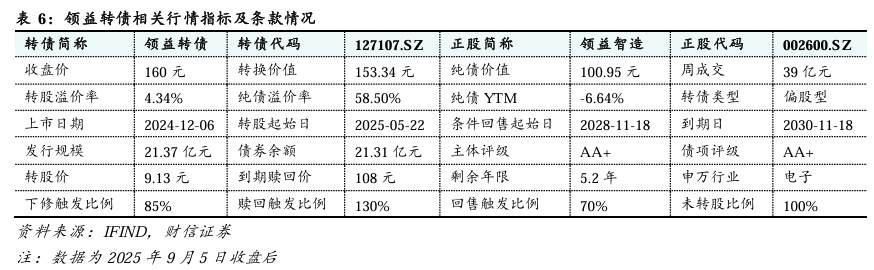 领益转债:偏股型转债。2024年12月6日上市,2025年5月22日进入转股期,为次新债。截至2025年9月5日,领益转债收盘价为160元,转股溢价率为4.34%,为偏股型转债;剩余余额为21.31亿元,规模相对较大;剩余期限为5.2年;债券评级为AA+,评级较高。