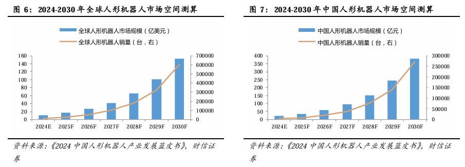 2)中国在人形机器人赛道潜力十足。依托于政府的战略引导和制度保障、坚实的产业链基础、巨大的内需市场和强大的技术研发实力,根据GGII预测,中国在人形机器人赛道的年均增速将高于全球平均水平,2024年中国人形机器人市场规模为21.58亿元,到2030年将达到近380亿元,2024-2030年CAGR将超过61%,中国人形机器人销量将从0.40万台左右增长至27.12万台。
