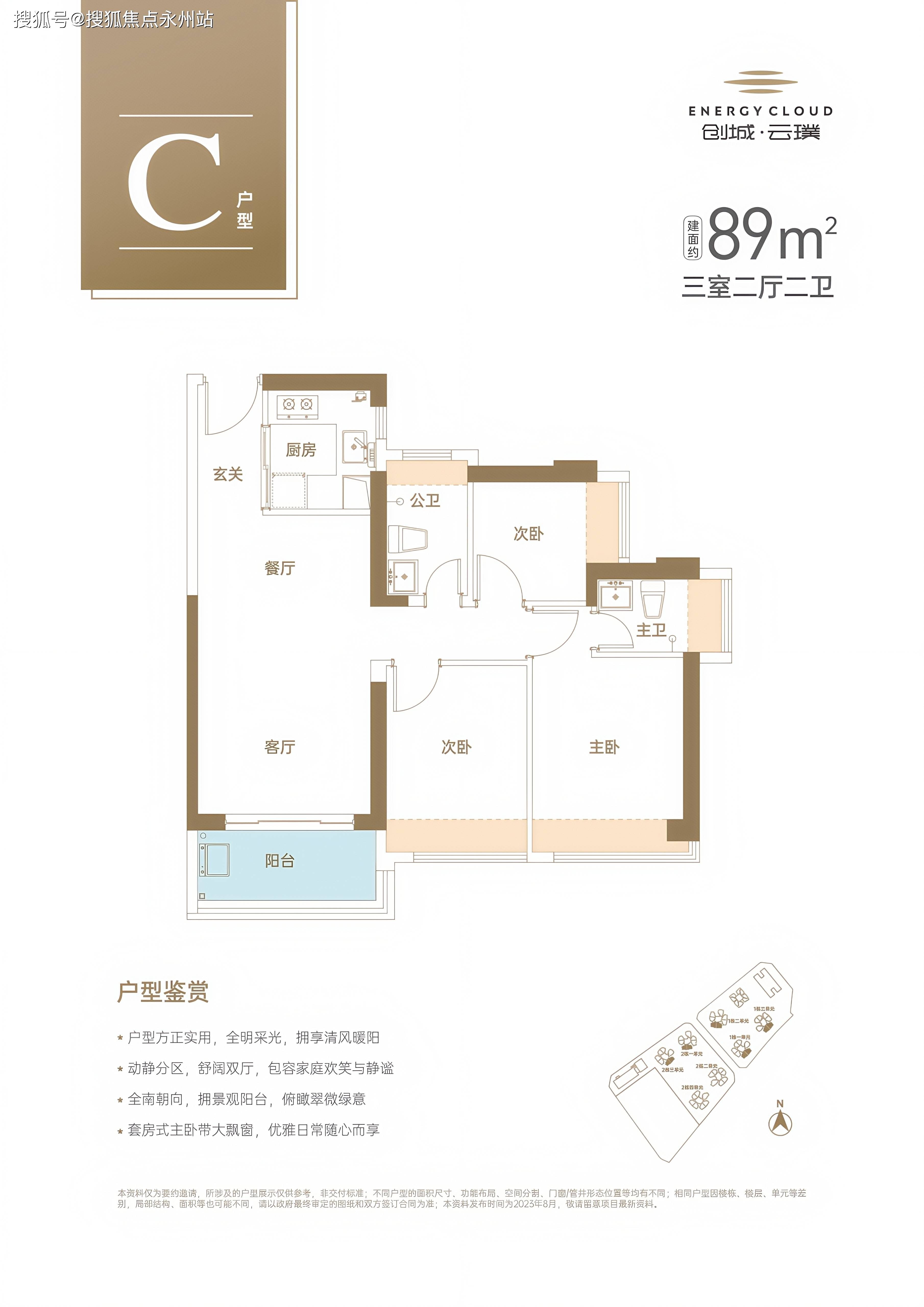 核心设计:动静分区明确,主卧套房带独立卫浴,北向次卧可改造为多功能房,客卫干湿分离。