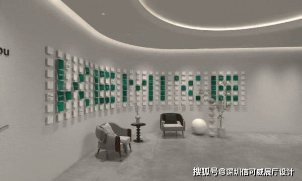 洽谈区的曲面背景设计融合品牌标识与产品展示,在暖光漫射下营造现代感与亲和力兼具的接待空间,绿植点缀的角落引入自然生机。