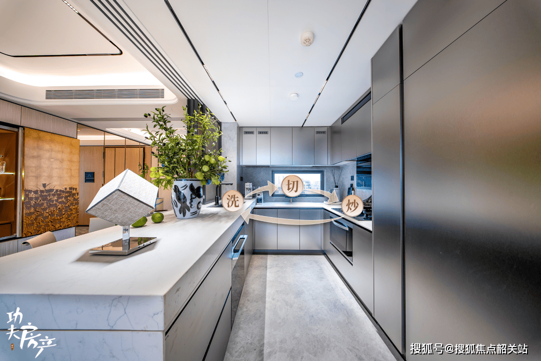动线设计上,洗-切-炒环节流畅闭合;横向采光窗的设计,不仅让厨房深处有自然光,横向吊柜也补充了大量收纳空间。