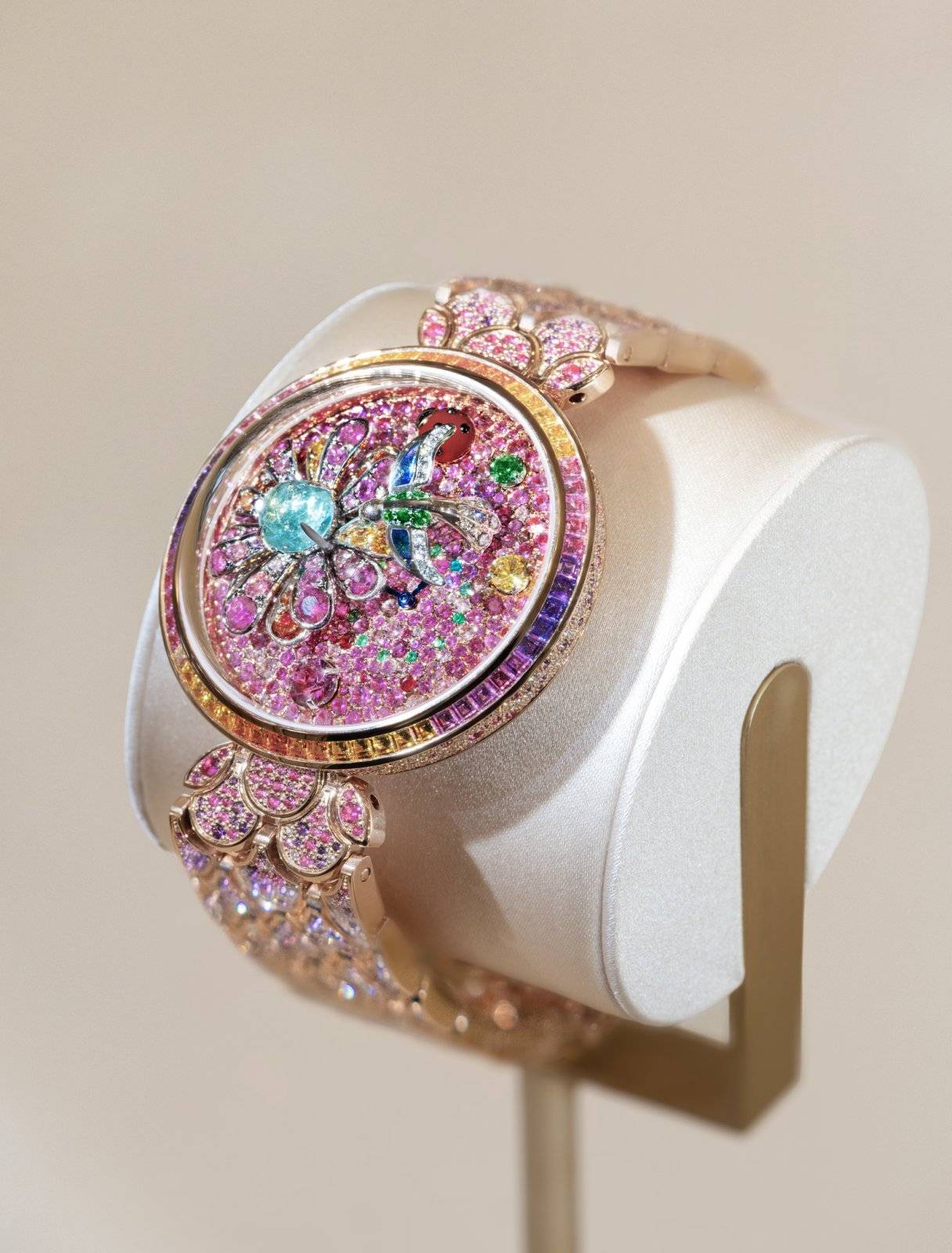 其中,宝格丽花园绮境(Il Giardino Diva)高级珠宝腕表从意式花园中汲取灵感,表盘以一颗帕拉伊巴碧玺镶嵌成花蕊造型,花卉及花园造型由粉色蓝宝石、粉色碧玺、黄色蓝宝石和石榴石打造,在方寸表盘间刻画出一座瑰丽而静谧的珠宝花园。
