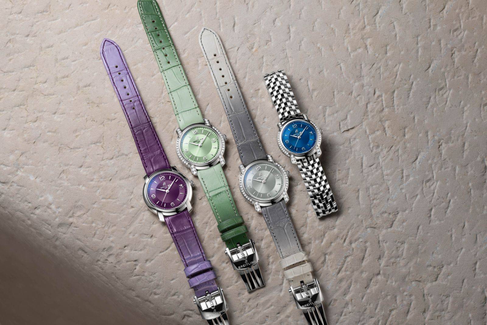 36毫米精钢款自动机械腕表的表盘配色丰富,有茄紫、鼠尾草绿和鸽灰三色可选,搭配同色系渐变鳄鱼皮表带。而18K金款则搭配渐变巧克力色表带。该款腕表搭载经瑞士官方天文台认证的百年灵10型自动上弦机芯,动力储存约42小时。