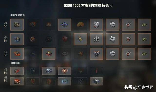 在乘员技能方面,可以参考上图方案进行选择。中型坦克的基础技能就是兄弟连、修理、侦察、态势感知、熟能生巧、人工稳定等技能。除此之外也可以在平稳行驶、机械达人等技能上进行选择。GSOR 1006方案7自身的隐蔽值比较偏低,而它的定位又需要经常在地图上四处游走,那么隐蔽技能是必须优先学习的。另外快速转弯、并肩作战、信号干扰、信号拦截等技能对坦克也有一定的收益,可以考虑学习。