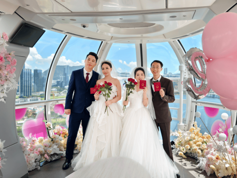在宝安区地标建筑摩天轮下,新人们乘坐寓意长长久久的9号轿厢,在蓝天、白云的见证下,进行结婚颁证仪式,许下一生的承诺。“我们来深圳已经2年多了,能深刻感受到深圳是一座很开放、包容的城市!”在2025年深圳举行的首届甜蜜经济高质量发展服务月开幕式现场,新婚夫妇何女士黎先生说。