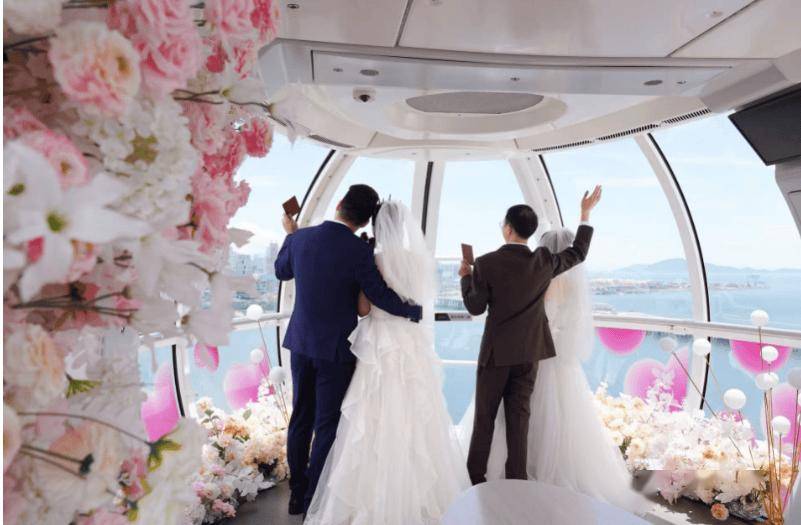 在宝安区地标建筑摩天轮下,新人们乘坐寓意长长久久的9号轿厢,在蓝天、白云的见证下,进行结婚颁证仪式,许下一生的承诺。“我们来深圳已经2年多了,能深刻感受到深圳是一座很开放、包容的城市!”在2025年深圳举行的首届甜蜜经济高质量发展服务月开幕式现场,新婚夫妇何女士黎先生说。