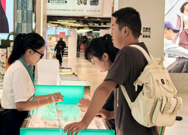 在昆明一家珠宝首饰店内,一些顾客正在选购心仪的黄金饰品。张先生准备在今年国庆节期间办订婚仪式,所以这段时间有空他就会和伴侣一起逛逛珠宝首饰店。张先生表示,他和伴侣购买了金手镯、金项链和金对戒,一共约50克。他坦言:“我们没有过多观望价格,赶在订婚之前就买了。毕竟这是结婚的刚需,早晚都得买。”