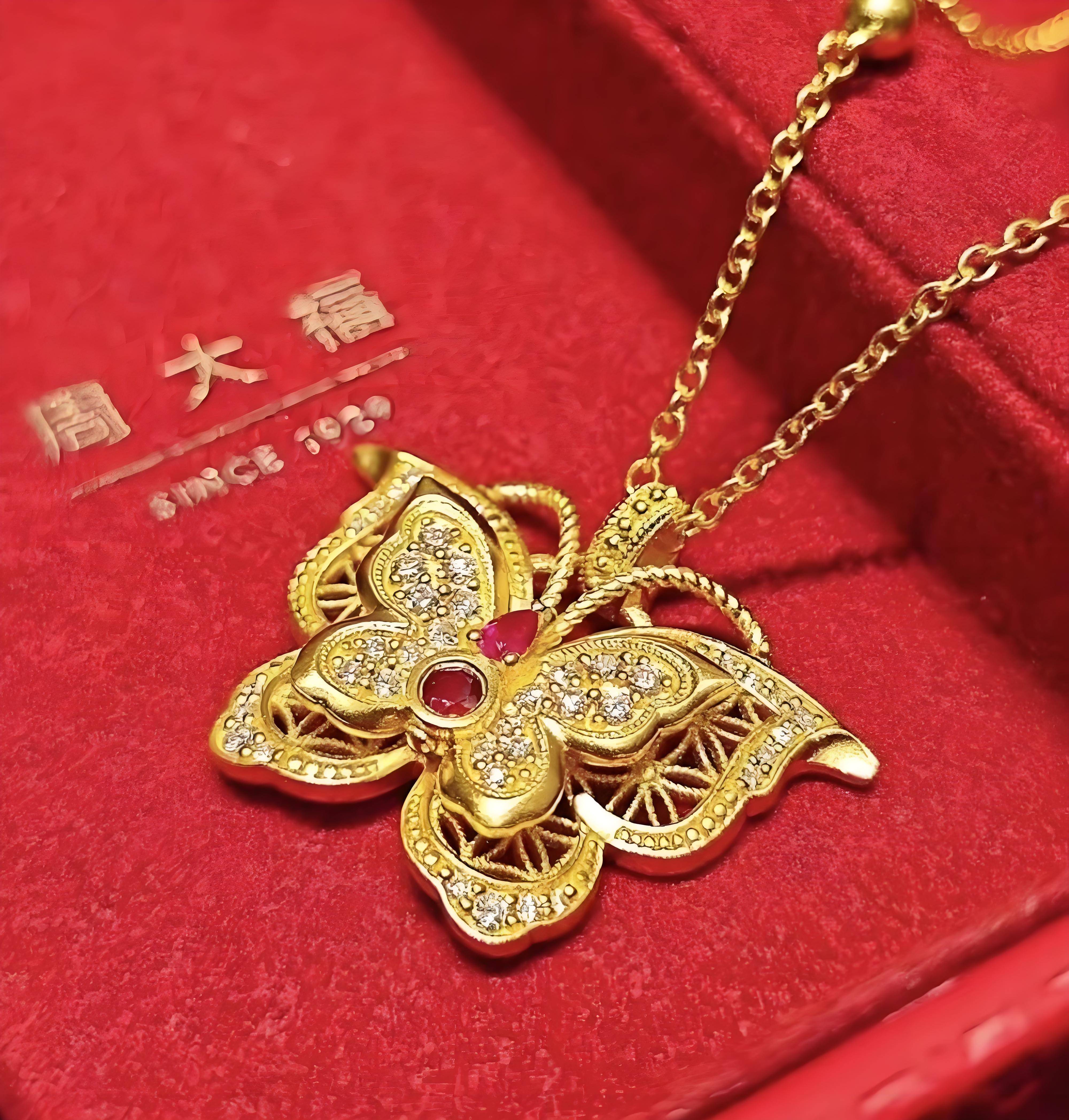 除卡通IP外,近年来,国风IP在黄金饰品中也常常出现。在上海一周大福门店,其故宫系列的联名黄金饰品摆放在入口显眼处,消费者一进店门便能看到。该店工作人员介绍,周大福故宫系列黄金饰品是周大福与故宫博物院今年合作推出的,目前线上线下都有,有时候线上的款会更多。